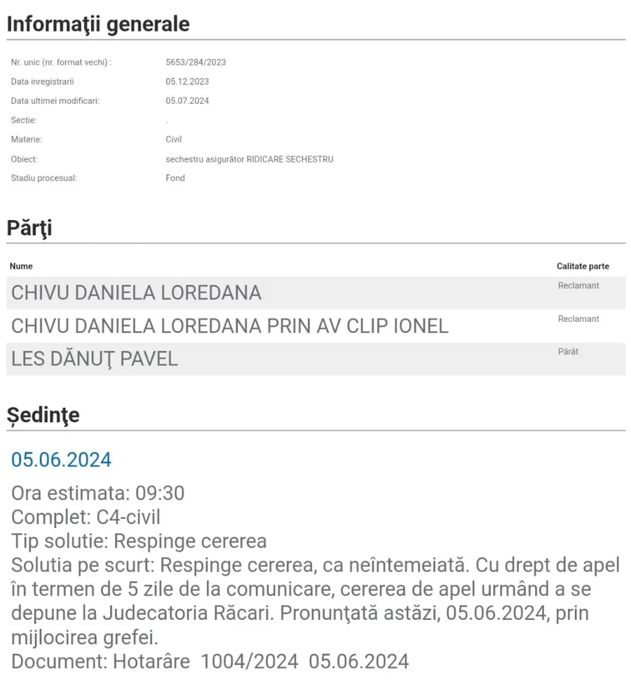 Loredana Chivu a acuzat în stânga și-n dreapta și, pe lângă Dani Leș, ținte au fost și judecătorii. Fosta lui iubită a spus că aproape toate bunurile din depozit (Imagini tari AICI) sunt ale ei, câștigate în instanță (deși decizia magistraților pare să fie alta, vezi faximil atașat în articol), apoi a îndreptat săgețile strict către cel care-i face viața un calvar (Vezi AICI declarațiile uluitoare).