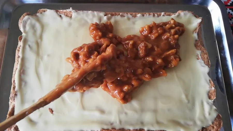 Când este gata, se toarnă peste blatul de nucă și se întinde pe toată suprafața. Nu uitați că blatul trebuie să fie rece. Lăsați crema de ciocolată albă să se întărească peste blat. Între timp, pregătiți caramelul. Aceasta este partea cea mai complicată a rețetei.