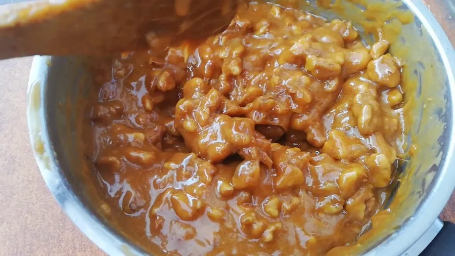 Puneți jumătate din cantitatea de zahăr într-o oală pe foc, pentru a-l topi. Amestecați mereu și aveți grijă să nu se ardă zahărul. Altfel, caramelul va fi amar. Când este gata, puneți untul și amestecați până se topește de tot. Separat, mixați gălbenușurile cu zahărul rămas. Adăugați această compoziție peste cea de caramel și amestecați în continuare, la foc mic. Puneți și arahidele și încorporați bine compoziția, până când aceasta devine groasă.