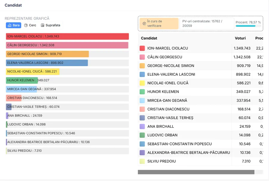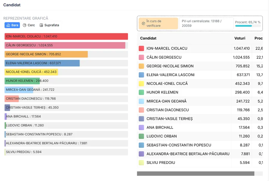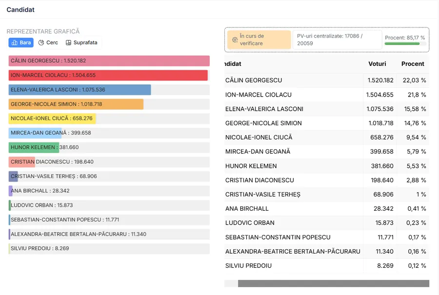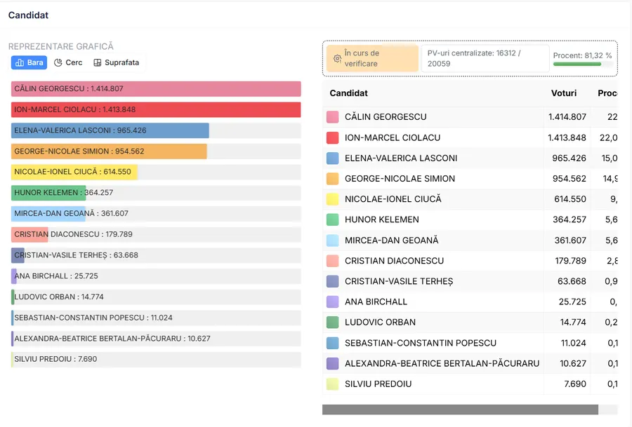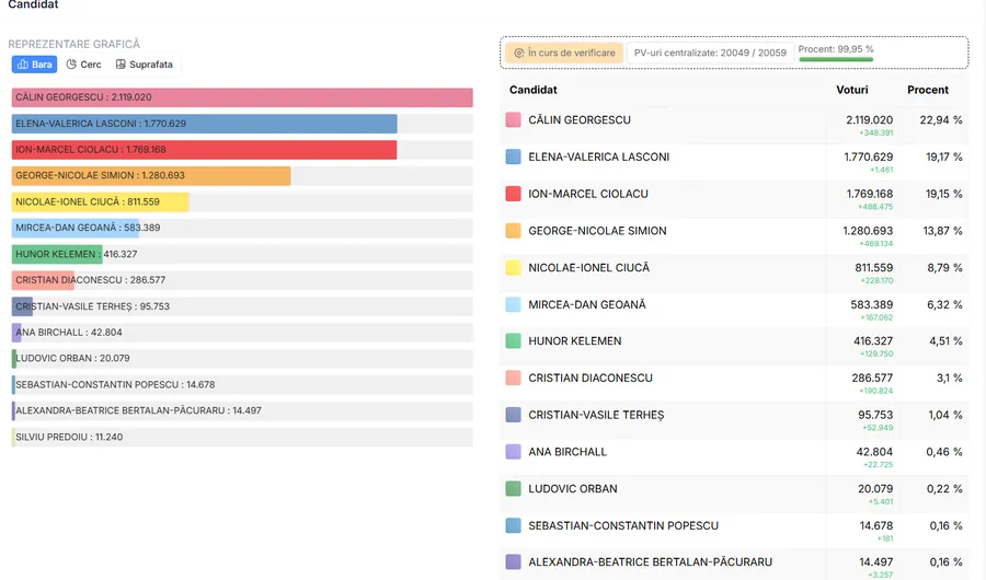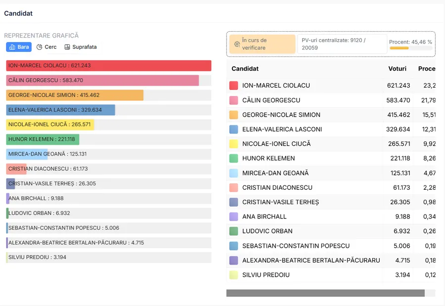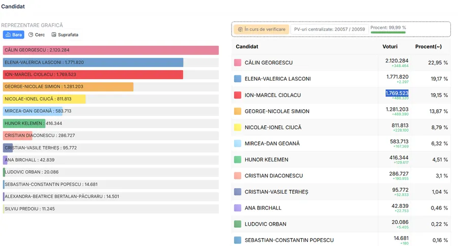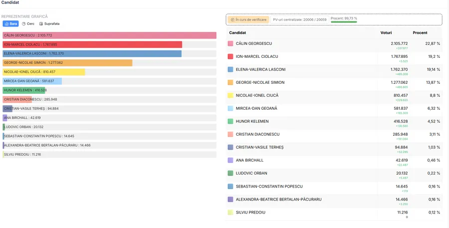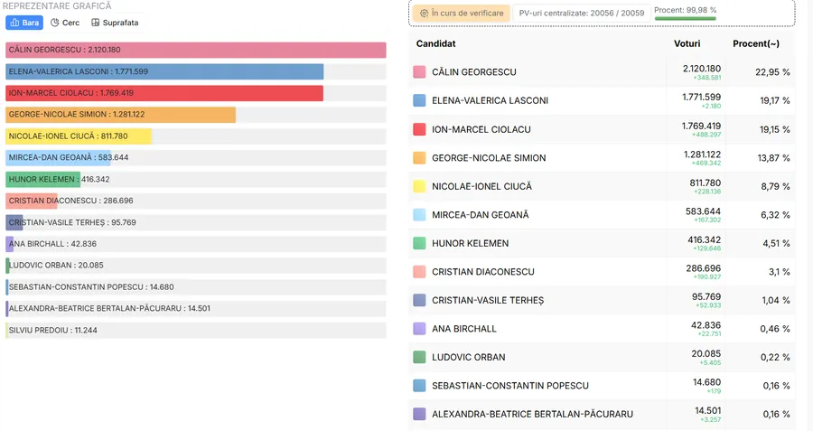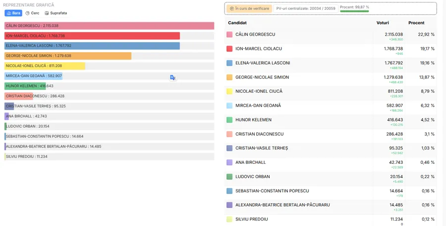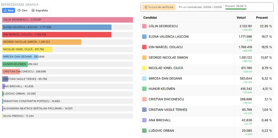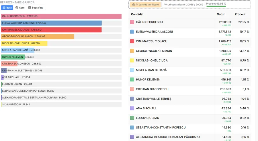 UPDATE ora 14:00: În timp ce Călin Georgescu și-a asigurat victoria, Elena Lasconi și Marcel Ciolacu încă își dispută locul 2. În prezent, candidata USR conduce cu 2.180 de voturi.