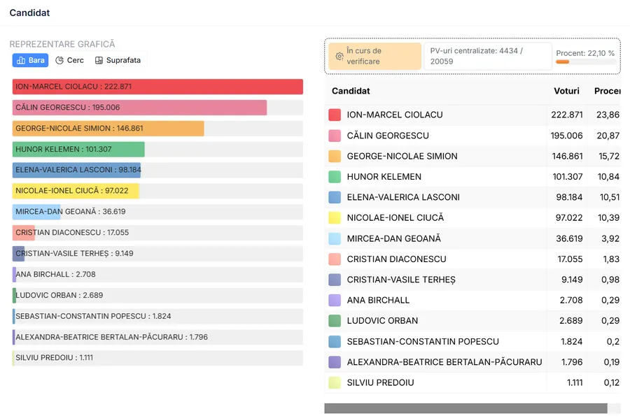 UPDATE 11:30: Numărătoarea voturilor continuă. Călin Georgescu rămâne pe primul loc (22,95 %), iar Elena Lasconi își asigură locul 2 (19,47%)