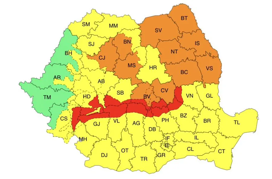 Sunt active și avertizări cod galben și portocaliu pentru Maramureș, Transilvania, Moldova, Dobrogea și zonele montane, unde se vor semnala ninsori viscolite, vizibilitate redusă sub 100 m și rafale de 50–90 km/h. În zonele montane înalte, vântul poate depăși 100–110 km/h.