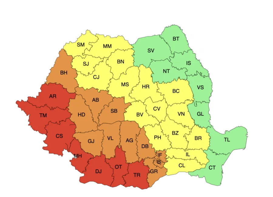 Sub cod roșu se află județele Arad, Timiș, Caraș-Severin, Mehedinți, Dolj, Olt și Teleorman, unde temperaturile maxime vor atinge între 39 și 41 de grade Celsius la umbră. Pe lângă temperaturile toride, nopțile tropicale vor aduce minime în jurul a 23 de grade, iar în Dealurile de Vest se vor înregistra chiar și 26 de grade Celsius. Disconfortul termic va fi deosebit de accentuat, cu indicele temperatură-umezeală (ITU) depășind pragul critic de 80 de unități.