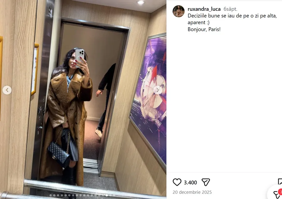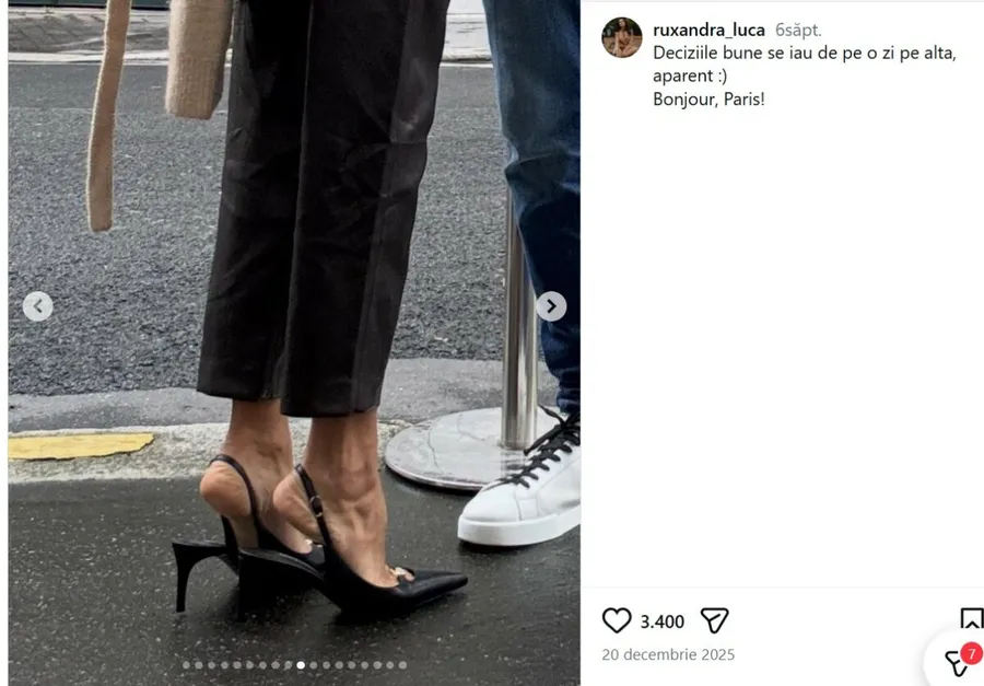 Cu puțin timp înainte de Crăciun, Ruxandra Luca a ajuns la Paris, iar caruselul de imagini publicat atunci a fost analizat la virgulă. Printre fotografiile cu ea, au apărut cadre sugestive: încălțămintea ei și a lui, surprinse împreună, dar și o imagine în care vedeta pare să se ridice pe vârfuri, într-un gest care lasă de înțeles că au avut parte de un sărut discret.