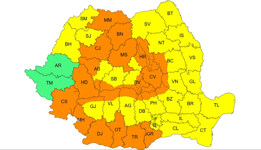 În vigoare mai este și un cod portocaliu de instabilitate atmosferică accentuată și averse importante cantitativ. Avertizarea vizează județele Caraș Severin, Hunedoara, Cluj, Mureș, Bistrița Năsăud, Maramureș, Covasna și la munte.