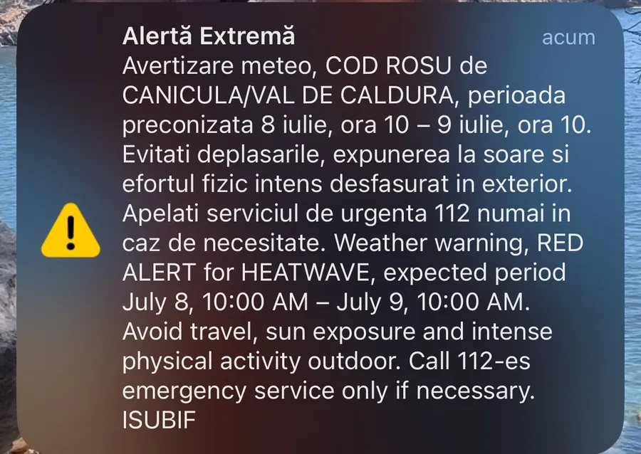 Avertizare meteo, COD ROȘU de CANICULĂ/VAL DE CALDURĂ, perioada preconizata 8 iulie, ora 10 – 9 iulie, ora 10. Evitați deplasările, expunerea la soare și efortul fizic intens desfășurat în exterior. Apelați serviciul de urgență 112 numai în caz de necesitate”, se arată în mesajul Ro-Alert.