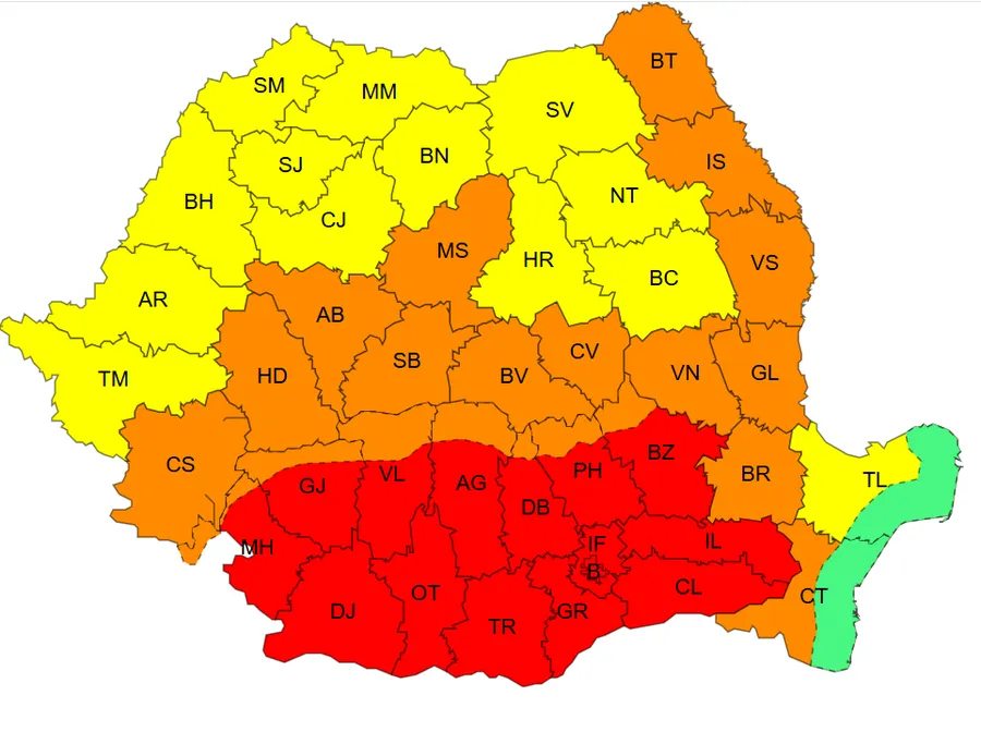 De asemenea, în vigoare mai este și un cod portocaliu, dar și unul galben de disconfort termic accentuat. Avertizările sunt valabile tot în intervalul 8 iulie, ora 10 – 9 iulie, ora 10 și acoperă aproape întreaga țară.