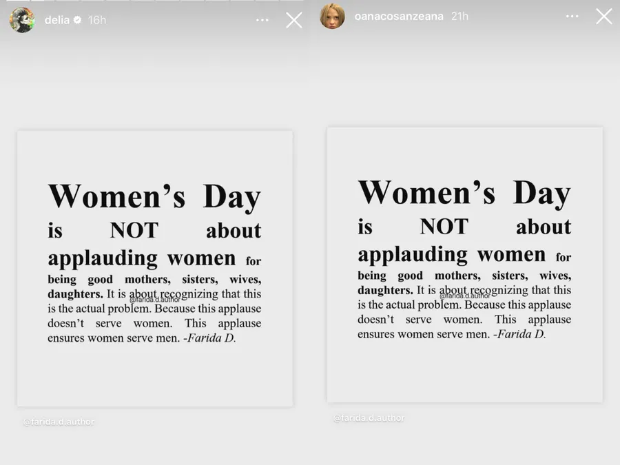 ”Ziua femeii nu este despre aplauzele dedicate femeilor pentru că sunt mame bune, surori, soții, fiice. Este vorba despre a recunoaște că aceasta este problema reală. Aceste aplauze nu servesc femeilor. Aceste aplauze asigură că femeile servesc bărbații”, a fost mesajul publicat de cele două.