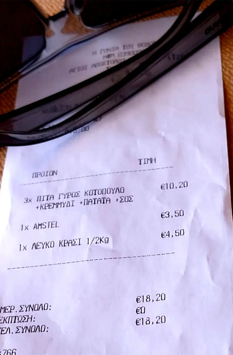 Fie că este vorba despre restaurante simple, ori taverne tradiționale, mâncarea grecească nu are cum să dezamăgească, evident că există și mici excepții. O româncă și-a făcut publică povestea și a dezvăluit câți euro au costat 3 gyros de pui, o bere și o carafă de vin, la o tavernă din regiunea Attica, la 40 de minute de Atena. Deși este greu de crezut, prânzul i-a costat pe români 18.20 euro, respectiv 90 de lei, adică 30 de lei de persoană, preț ce pare să fie greu de egalat în România.