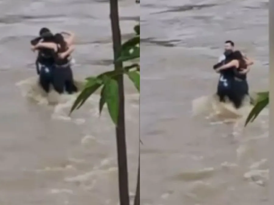 Momentul în care cei trei tineri au rămas strâns îmbrățișați în fața viiturii/ sursă foto: captură video