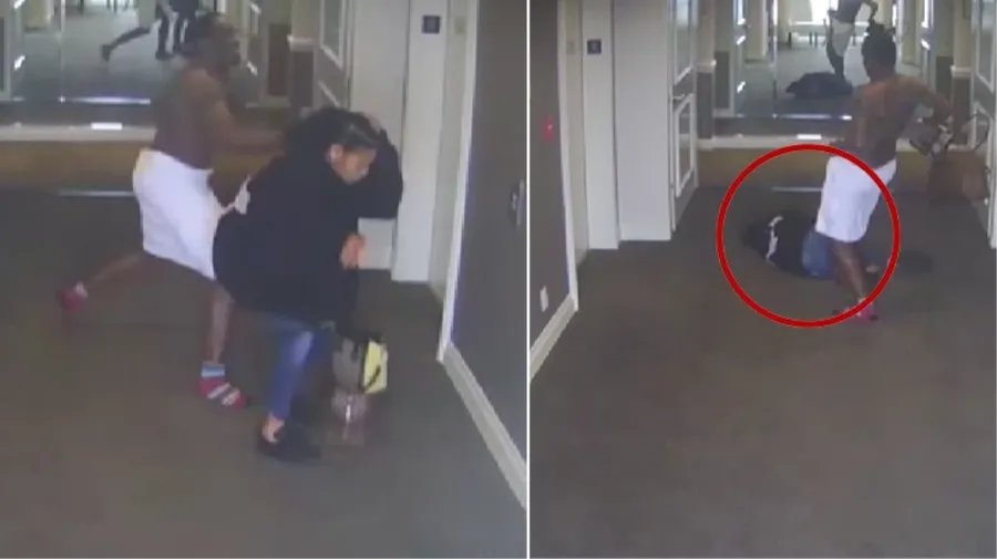 În imagini, Diddy o prinde pe Cassie de glugă și o trântește la podea. (SURSA: CNN)