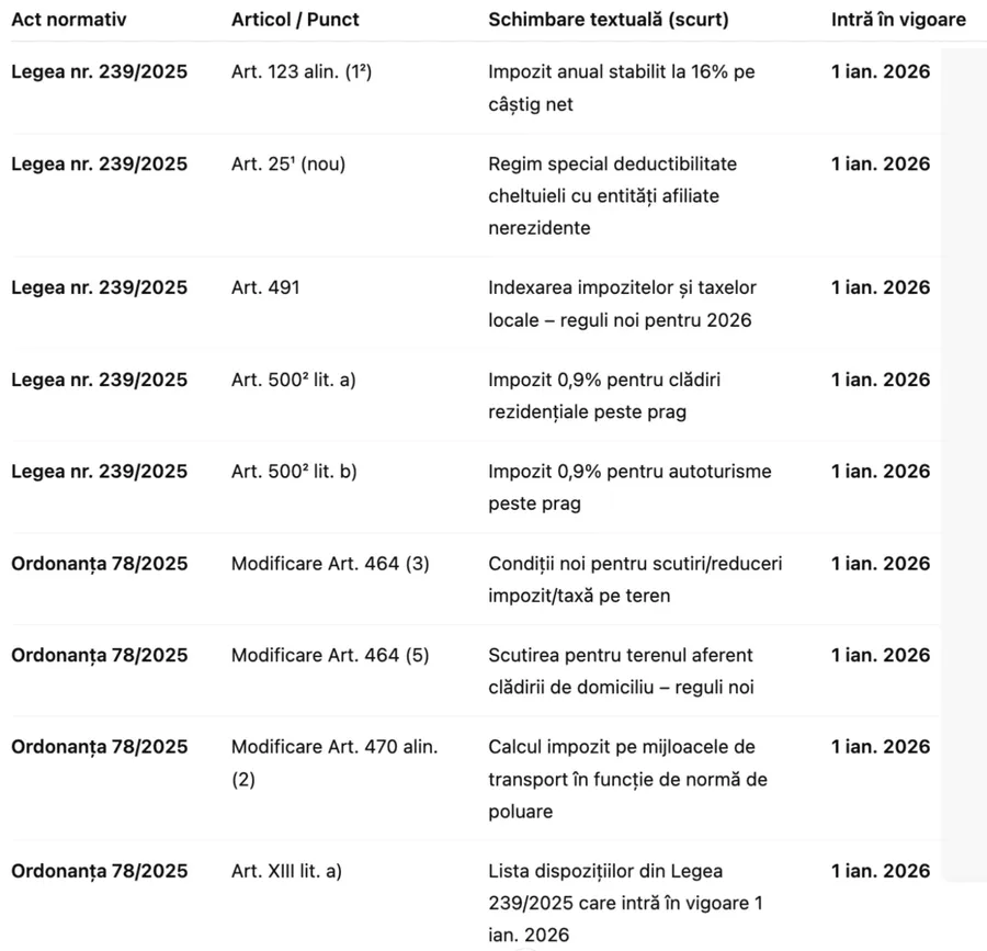 Începând cu 1 ianuarie 2026, cadrul legislativ din România suferă modificări importante, odată cu aplicarea unor noi prevederi legale care vizează fiscalitatea și impozitarea.