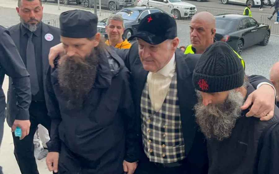 Gigi Becali și cei doi călugări alături de care a mers însoțit la Arena Națională / Foto: Captură Video