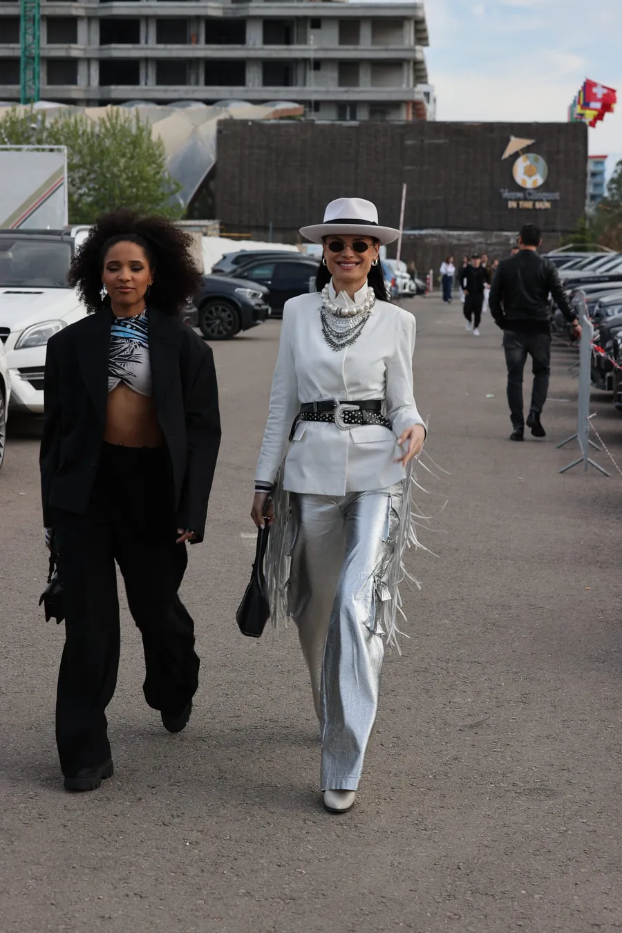 Mai jos vedem, în sfârșit, două domnișoare care chiar și-au dat interesul în totalitate! Este vorba despre Irisha și Becky Bachata, ambele foste concurente la ”Bravo, ai stil!”. Dansatoarea a optat pentru un costum negru și un top colorat. Irisha a fost ceva mai inventivă, așa cum ne-a obișnuit deja! Influencerița a purtat o pălărie albă, un sacou, pe care l-a accesorizat cu mai multe curele în talie, pantaloni argintii, cu franjuri și ochelari de soare.
