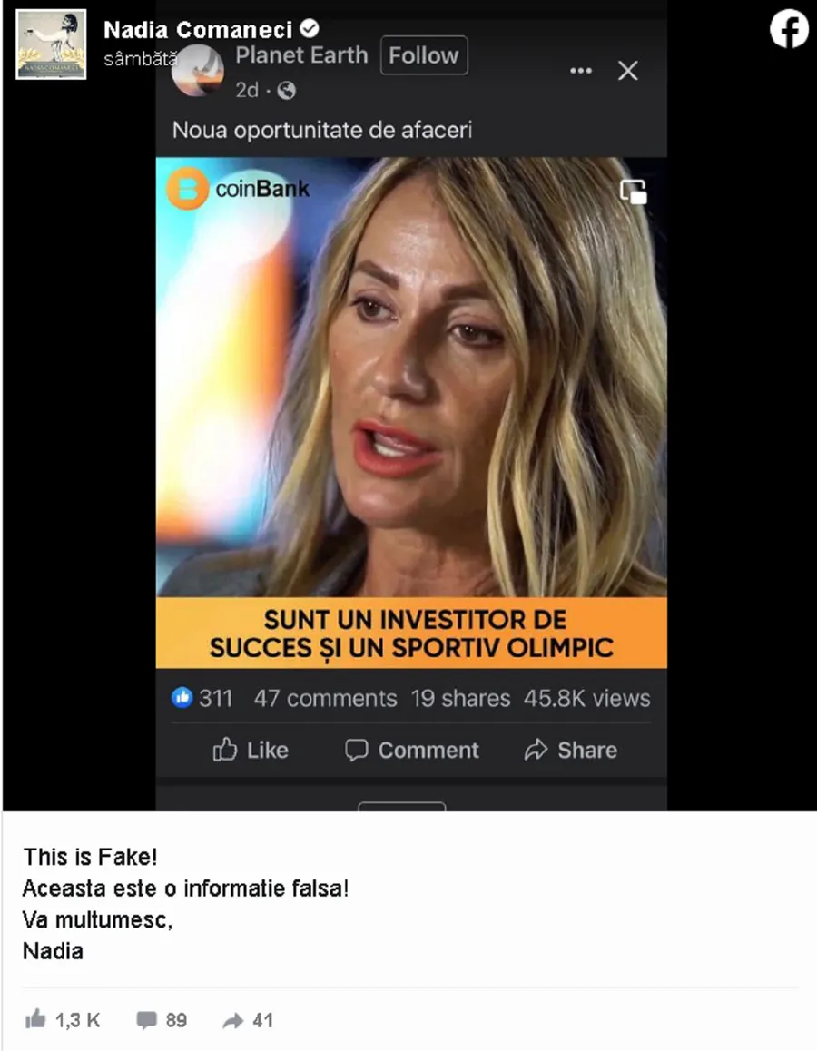 Cel mai probabil, Nadia a fost informată de falsa campanie a cărei imagine este și a publicat un mesaj pe Facebook, acolo unde își atenționează urmăritorii să fie atenți și să nu se lase păcăliți de asemenea anunțuri: „This is Fake! Aceasta este o informație falsă! Vă mulțumesc, Nadia”, a scris marea campioană pe pagina sa de Facebook.