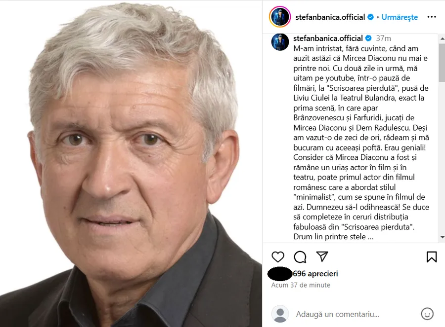 Erau geniali! Consider că Mircea Diaconu a fost și rămâne un uriaș actor în film și în teatru, poate primul actor din filmul românesc care a abordat stilul ‘minimalist’, cum se spune în filmul de azi. Dumnezeu să-l odihnească! Se duce să completeze în ceruri distribuția fabuloasă din ‘Scrisoarea pierdută’. Drum lin printre stele…”, a scris Ștefan Bănică Jr. pe pagina sa de Instagram.