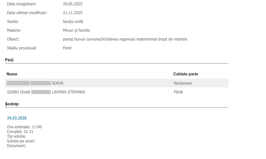Dosarul a fost inițiat în luna mai de către fostul soț, care a solicitat evaluarea și împărțirea bunurilor aflate în locuința medicului. Însă, deși întreaga țară aflase despre moartea Ștefaniei Szabo încă din data de 28 octombrie, pe 21 noiembrie instanța a emis în mod inexplicabil citația, chemând-o în judecată anul viitor, pe 24 martie 2026.