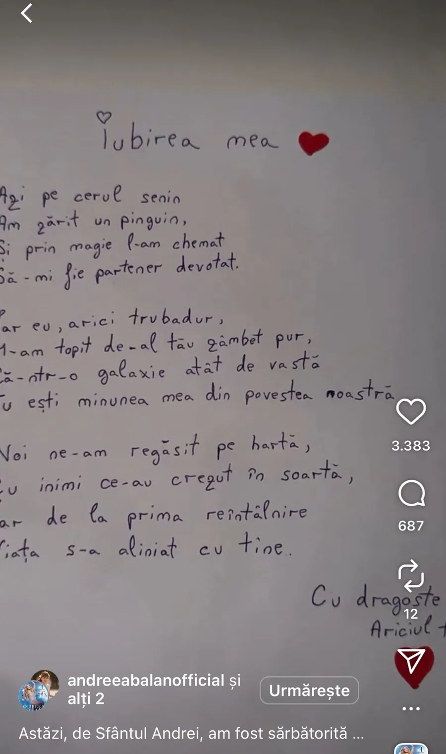 Momentul culminant a venit însă din partea lui Victor Cornea, viitorul ei soț, care i-a oferit Andreei o scrisoare emoționantă. Rândurile pline de iubire pe care acesta le-a scris, au făcut-o pe artistă să izbucnească în lacrimi de fericire.
