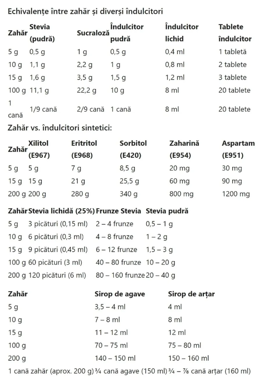 Tabel complet | Cu ce poți înlocui zahărul în rețete și câte grame trebuie să folosești