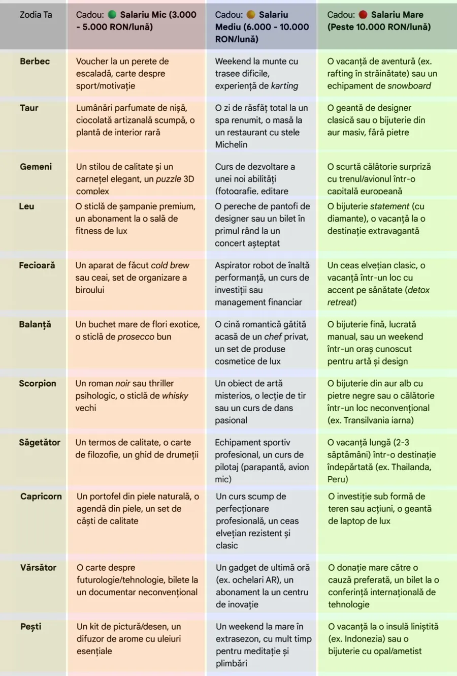 Sărbătorile de iarnă bat la ușă, iar majoritatea românilor deja au pornit în goana după cadouri. La acest capitol bărbații nu sunt, de obicei, prea inspirați, dar nu trebuie să își facă griji. Tot ce au de făcut în acest an este să consulte tabelul de mai jos. Iată ce cadou poți să îi faci iubitei tale, în funcție de zodia ei și de salariul tău. Totul e mult mai simplu acum.