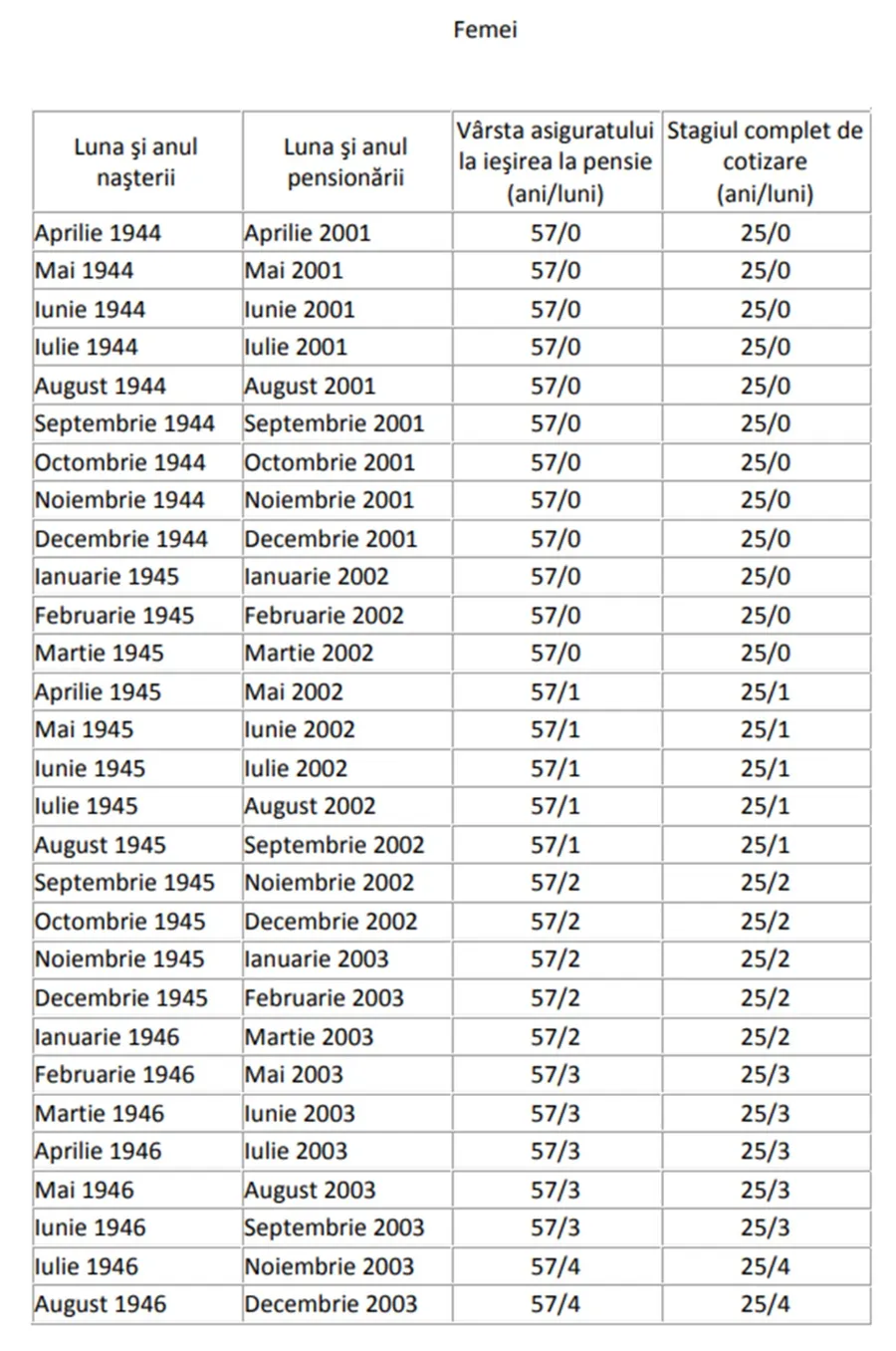 Autoritățile au pus la dispoziție un tabel oficial, dedicat exclusiv femeilor, în care este menționat, în funcție de anul și luna nașterii, vârsta standard de pensionare, data ieșirii la pensie și numărul de ani necesari de cotizare pentru pensie integrală. Ultima coloană, cea cu stagiul complet de cotizare, este deosebit de importantă pentru calculul pensiei finale.