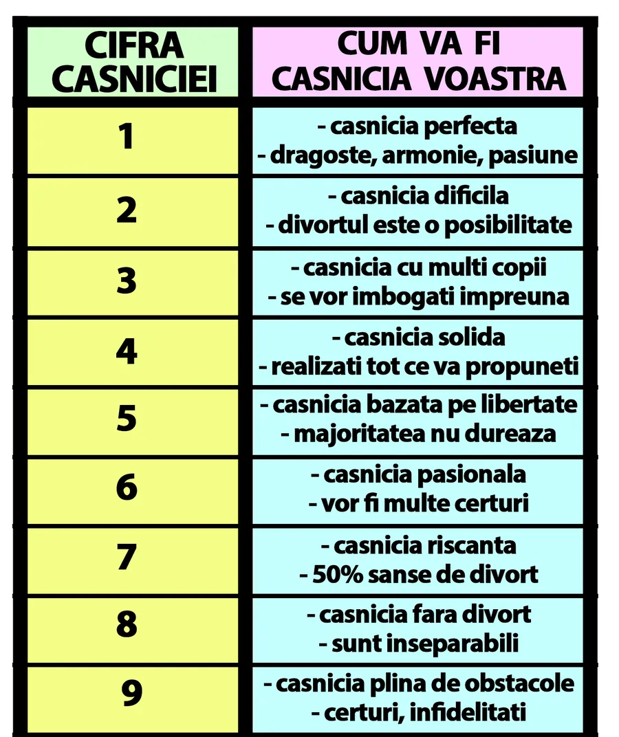Pentru a putea calcula cifra de care ai nevoie pentru a vedea destinul căsniciei, trebuie să aduni toate cifrele din componența datei. De exemplu, dacă te căsătorești pe 1. 10. 2023, trebuie să faci calculul: 1+10+2+0+2+3=18, apoi faci 1+8=9. Ca urmare, numărul pe care trebuie să îl urmărești este 9.
