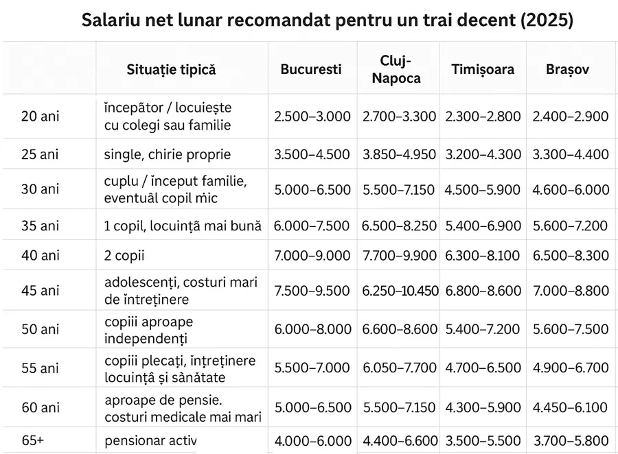 Situația se schimbă rapid la 25 de ani, când mulți aleg să trăiască pe cont propriu, plătind chiria din venitul personal. În acest caz, nivelul minim al traiului decent urcă în capitală la 3.500 – 4.500 lei. În Cluj-Napoca, oraș recunoscut pentru chiriile ridicate, este nevoie de 3.850 – 4.950 lei, în timp ce în Timișoara și Brașov suma variază între 3.200 – 4.400 lei.