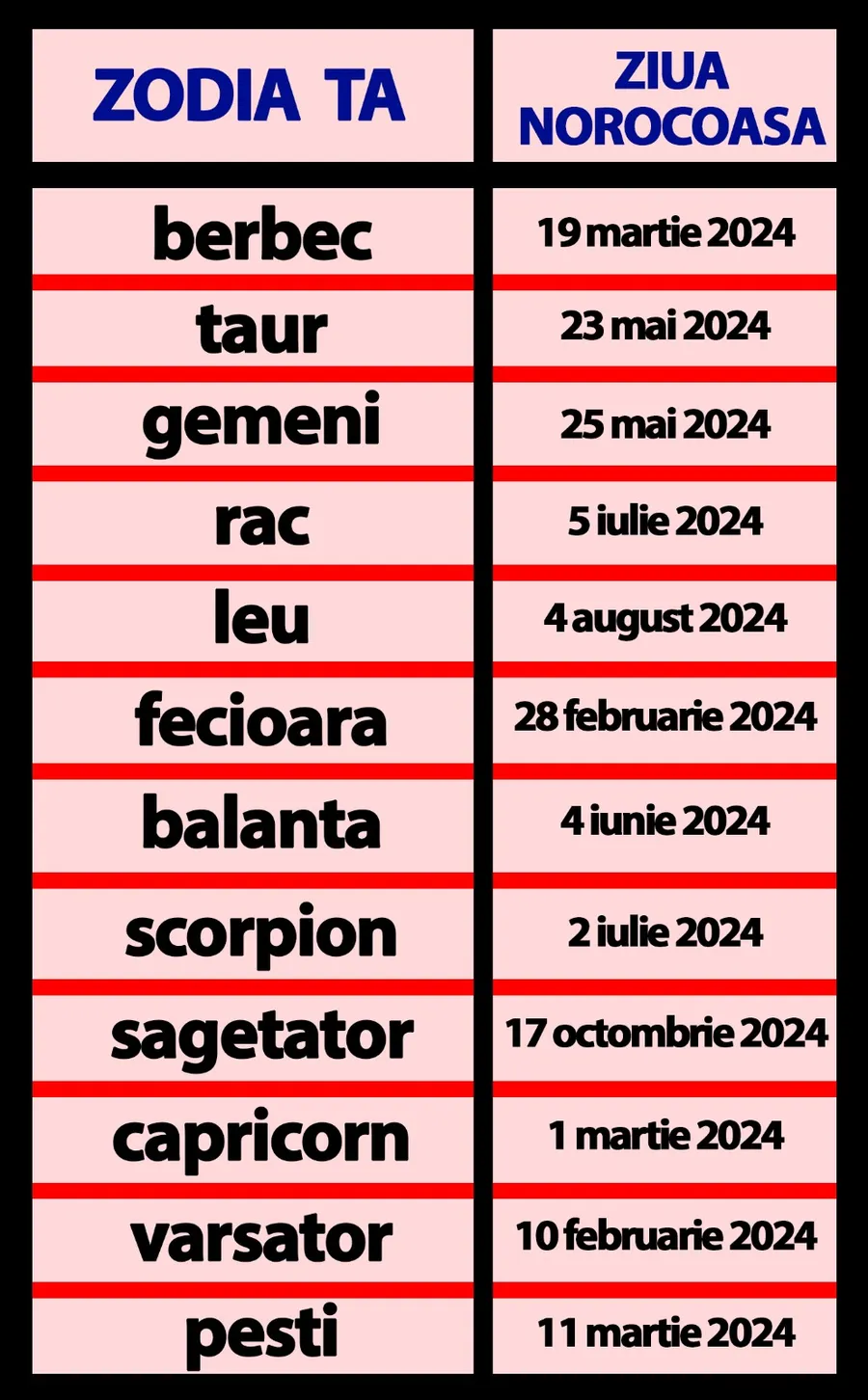Cea mai norocoasă zi: 19 martie 2024