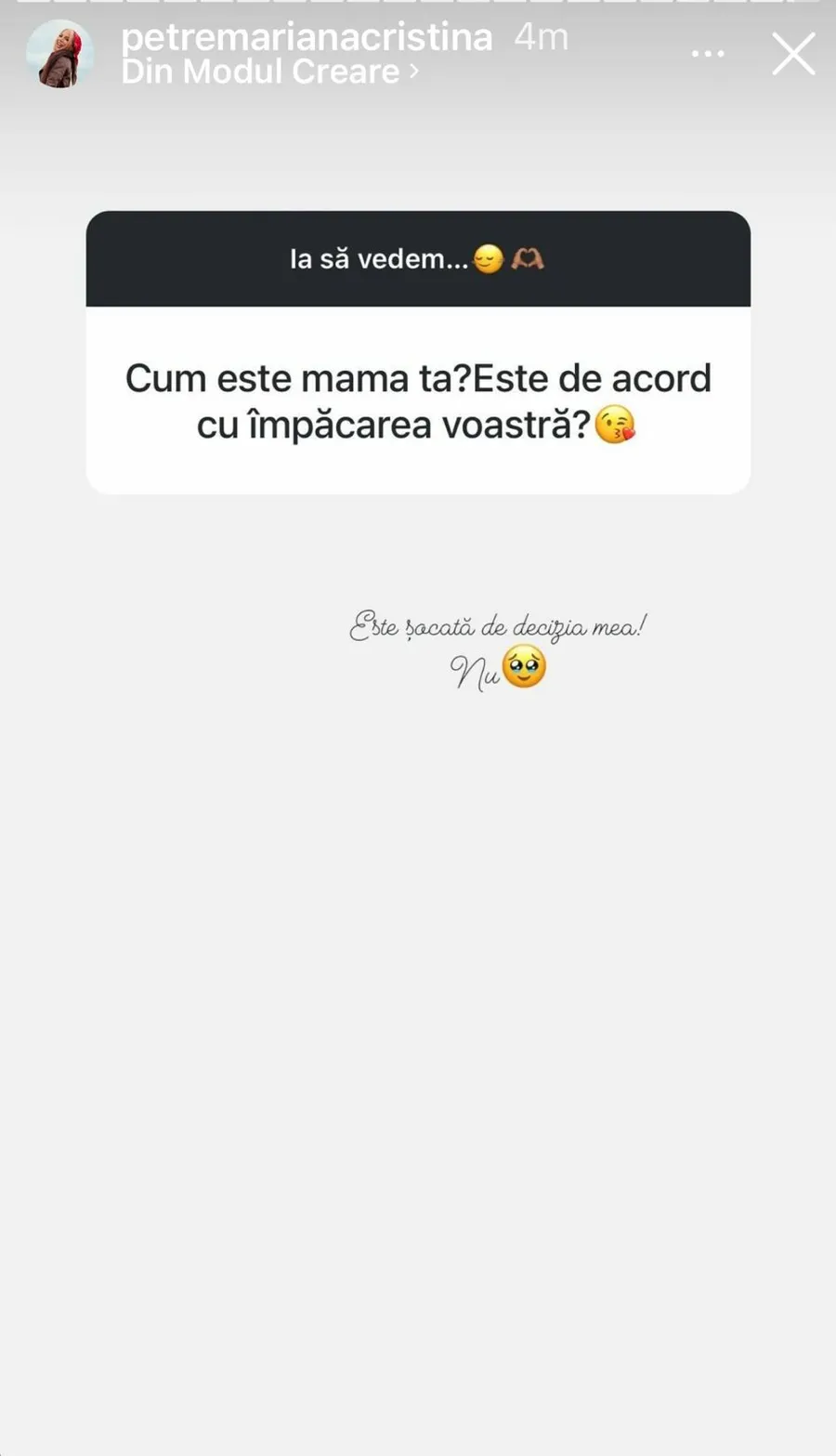 Cristina a fost întrebată recent pe rețelele de socializare dacă mama ei este de acord cu împăcarea, iar acesta a răspuns: „Este șocată de decizia mea! Nu!”