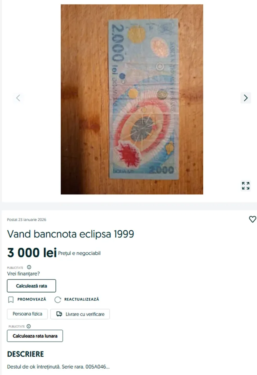 Bancnota românească cu eclipsa din 1999 revine spectaculos în atenția colecționarilor în 2026, iar imaginile surprinse într-un anunț recent arată cât de mult a crescut valoarea acestei piese.