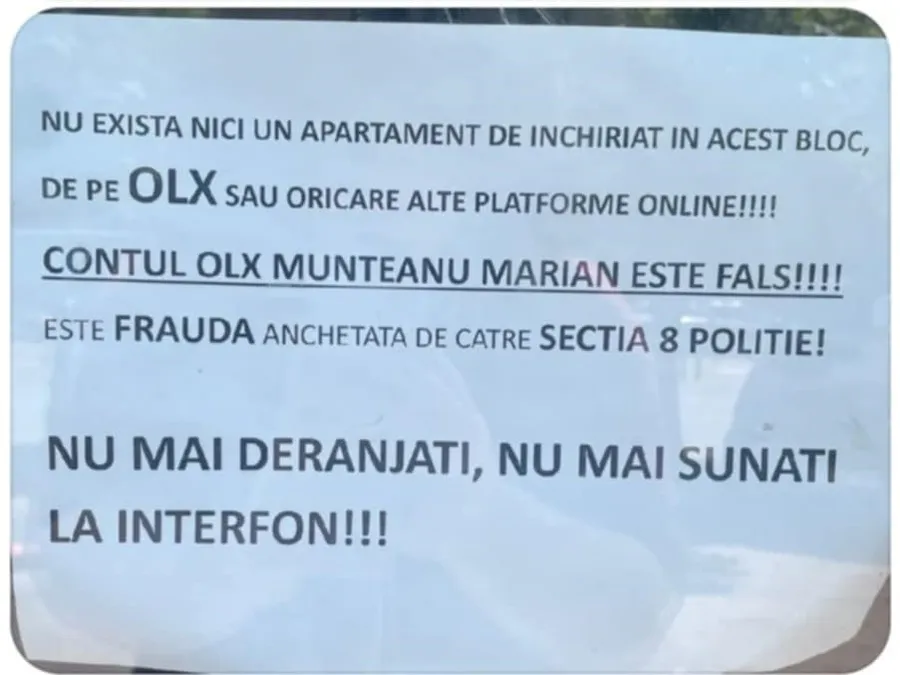 ”Nu există niciun apartament de închiriat în acest bloc, de pe OLX sau orice alte platforme online!!! Contul OLX Munteanu Marian este fals! Este fraudă anchetată de către Secția 8 Poliție. Nu mai deranjați, nu mai sunați la interfon!”, este anunțul care le întâmpină pe victime.