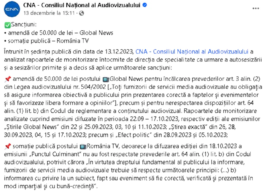 Televiziunea Global News a primit amendă de 10.000 de euro de la CNA