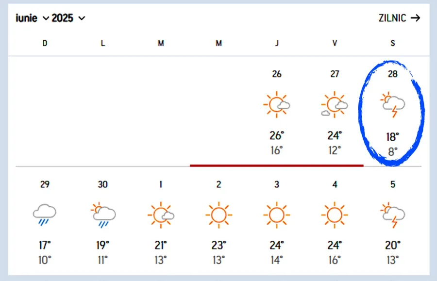 Așa cum spuneam, după câteva zile grele, cu temperaturi ce au depășit 40 de grade, vremea se schimbă brusc. Temperaturile încep să scadă încă de joi seara, 26 iunie, iar precipitațiile își fac apariția. Weekend-ul aduce o vreme rece și mult mai puține grade în termometre.