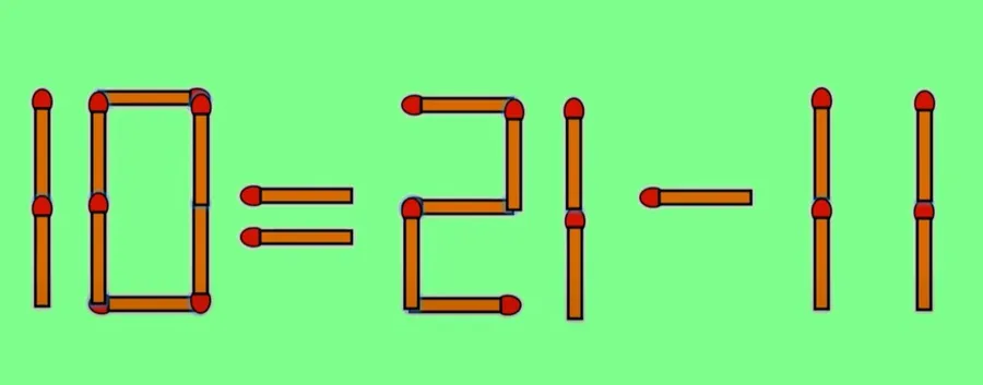 Rezolvare: Pentru ca ecuația să fie corectă, trebuie să mutați un băț de chibrit de la „=” la „-”. Astfel, 10 – 21 = 11 se va transforma în 10 = 21 – 11.