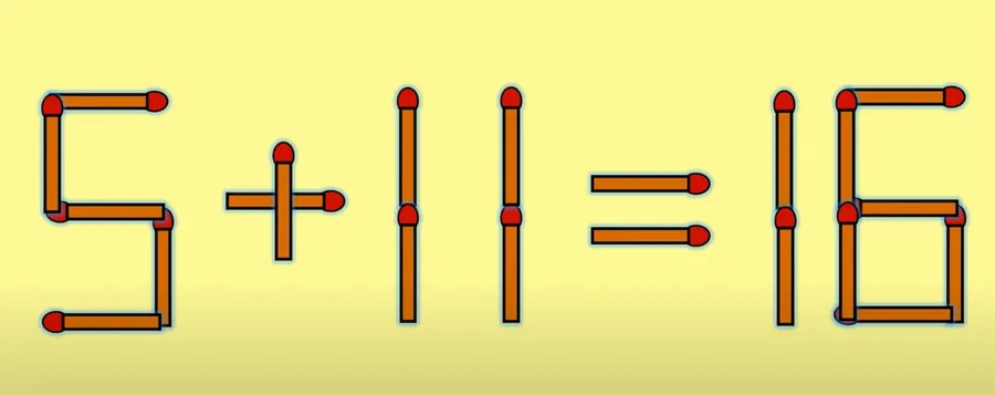 REZOLVARE: Ei bine, așa cum am spus mai sus, provocarea de astăzi nu este deloc grea. Printr-o singură mișcare, obțineți rezultatul acestui test. Totuși, dacă v-am provocat, dar nu ați găsit reolvarea… vă ajutăm noi. Se ia un băț de chibrit de la cifra 5 (care devine 5) și se mută la cifra 5 din rezultatul 15 (devenind 16). Prin urmare, ecuația corectă este: 5+11=16.