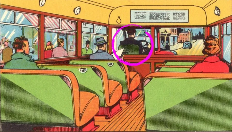 Pentru a identifica răspunsul corect, trebuie să acordăm mare atenție detaliilor, căci acestea o să ne indice greșeala. Așadar, privirea ar trebui să ni se îndrepte către șoferul autobuzului. Mai exact, greșeala din imagine este că scaunul șoferului de autobuz este orientat în direcția greșită. Greșeala este evidențiată în imaginea de mai jos.