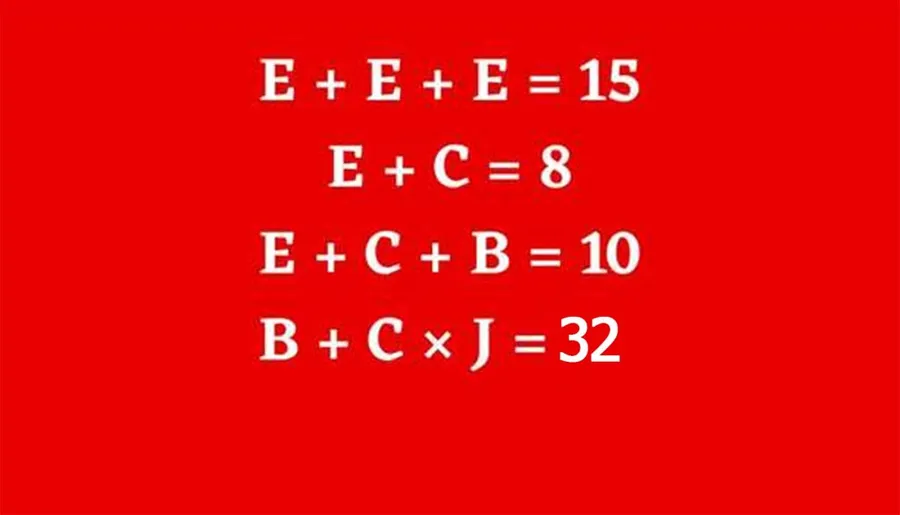 Test de inteligență | Cât este E + C x J, dacă E+E+E=15, E+C=8 și E+C+B=10?