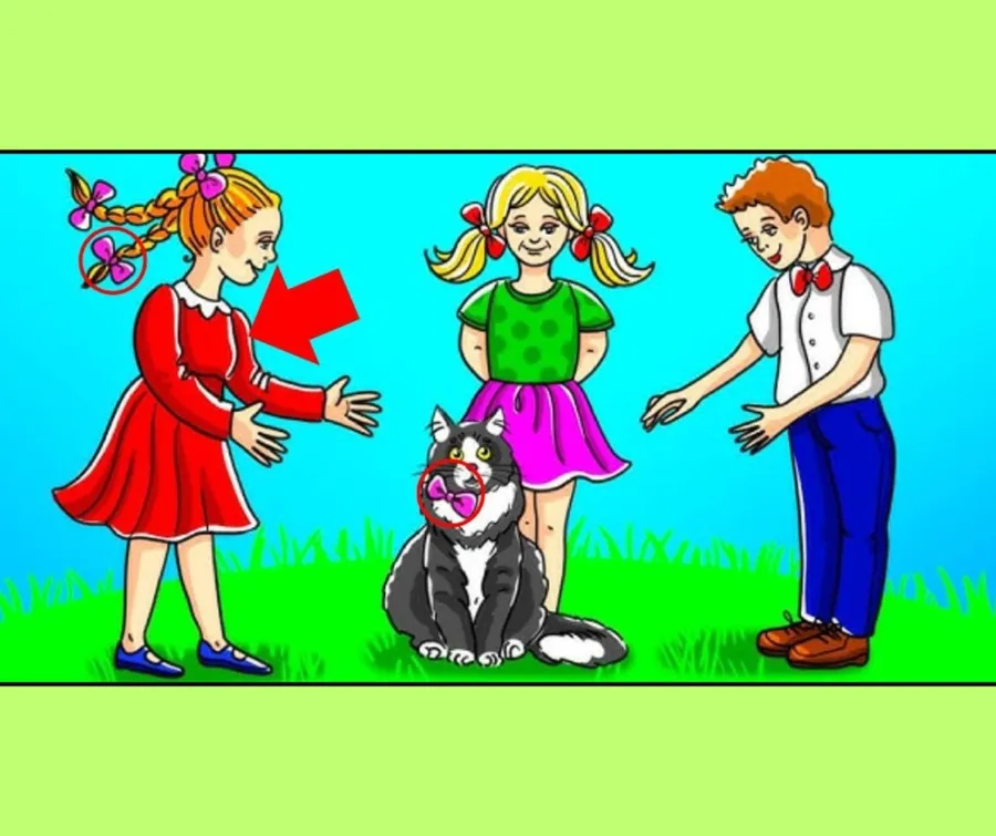 Fotografia este una complexă pentru că prezintă foarte multe elemente. Din acest motiv, este foarte greu să identificați răspunsul corect. Ei bine, prima fetiță este stăpâna pisicii. Dacă vă uitați cu atenție, veți observa că felina poartă o fundiță exact precum sunt cele din părul fetei. Priviți imaginea de mai jos pentru a înțelege mai bine!