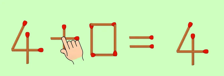 Un singur chibrit trebuie să fie mutat pentru ca egalitatea mai sus amintită, 4-0=14, să devină corectă. Trebuie să priviți cu atenție cele 14 chibrituri din imagine. Dacă nu ați reușit să descoperiți răspunsul corect, atunci Cancan.ro vă sare în ajutor. În acest sens, trebuie să mutați chibritul care reprezintă cifra 1 și să îl transformați în operație matematică. Cu alte cuvinte, „1” de la rezultat se va muta la minus, operație matematică care va deveni plus („+”). Astfel, avem: 4+0=4.