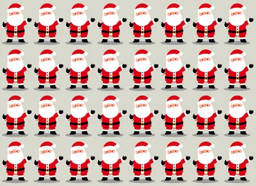 La prima vedere, toți sunt la fel, însă unul dintre ei este diferit. Iar pentru a-l identifica, trebuie să fiți atenți la fiecare detaliu, de la obiectele de îmbrăcăminte până la barbă sau poziția în care se află. Moș Crăciun cel diferit față de ceilalți se află pe al treilea rând de sus în jos, fiind cel cu numărul 6. Dacă vă uitați cu atenție, puteți observa că are catarama de la curea mult mai strălucitoare decât ceilalți.