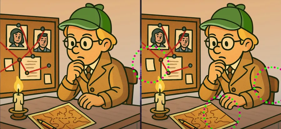 Ei bine, prima diferență poate fi observată pe panul cu probe. În a doua fotografie lipsește una din benzile roșii. O altă diferența constă în liniile trasate pe hartă, una dintre ele fiind mai scurtă în a doua imagine decât în prima. A treia diferență o să o vedeți dacă analizați cu atenție scaunul pe care stă detectivul. Priviți pozele, mai jos, pentru a înțelege mai bine!