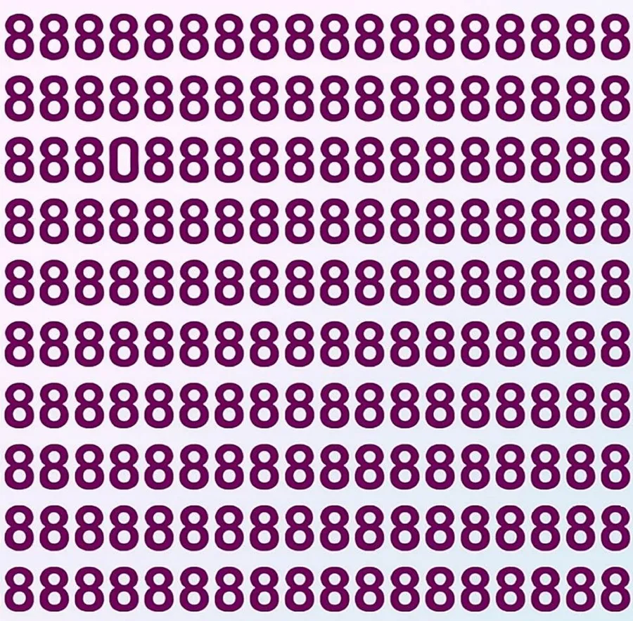 Astăzi îți propunem un test vizual special: găsește cifra „0” ascunsă într-un șir de cifre „8”. La prima vedere, totul pare identic, dar printre toate „8”-urile se află un „0”, ascuns cu atenție. Provocarea este să-l găsești în doar 7 secunde. Doar 1% dintre oameni reușesc să-l descopere atât de rapid, ceea ce face testul un adevărat exercițiu pentru percepție, observație și viteză de reacție.