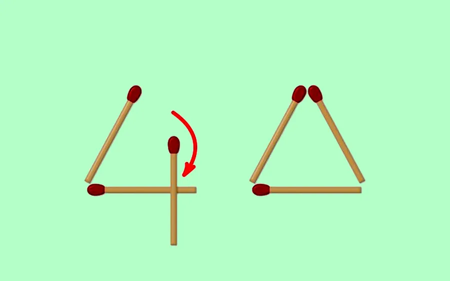 Pentru a rezolva acest test trebuie să-și dai seama de o „șmecherie”. Mai exact, pentru a rezolva problema, trebuie să mutați un băț pentru a forma cifra 4. Astfel, la final nu vei avea triunghiuri în forma lor tradițională, ci vei scrie numărul alături de un singur triunghi.