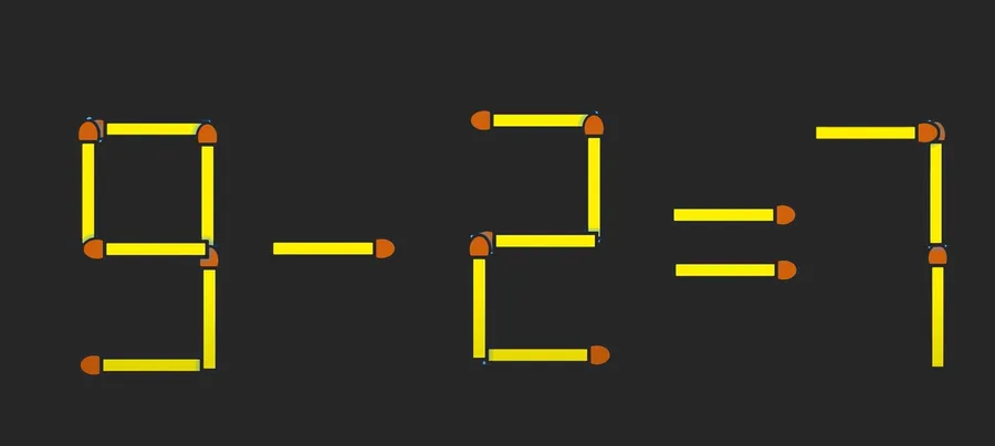 Pentru a corecta egalitatea, tot ce trebuie să faci este să iei bățul de chibrit de la semnul „+” și să îl muți la cifra „1”, astfel vei forma numărul „7”, iar egalitatea va fi una corectă: „9 – 2= 7”.