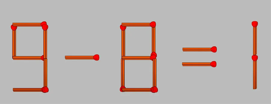 Pentru a corecta egalitatea, tot ce trebuie să faci este să iei unul dintre bețele din componența numărului „8” și să îl muți la cifra „6” pentru a forma „8”. Astfel ecuația se va transforma în 9-8=1.