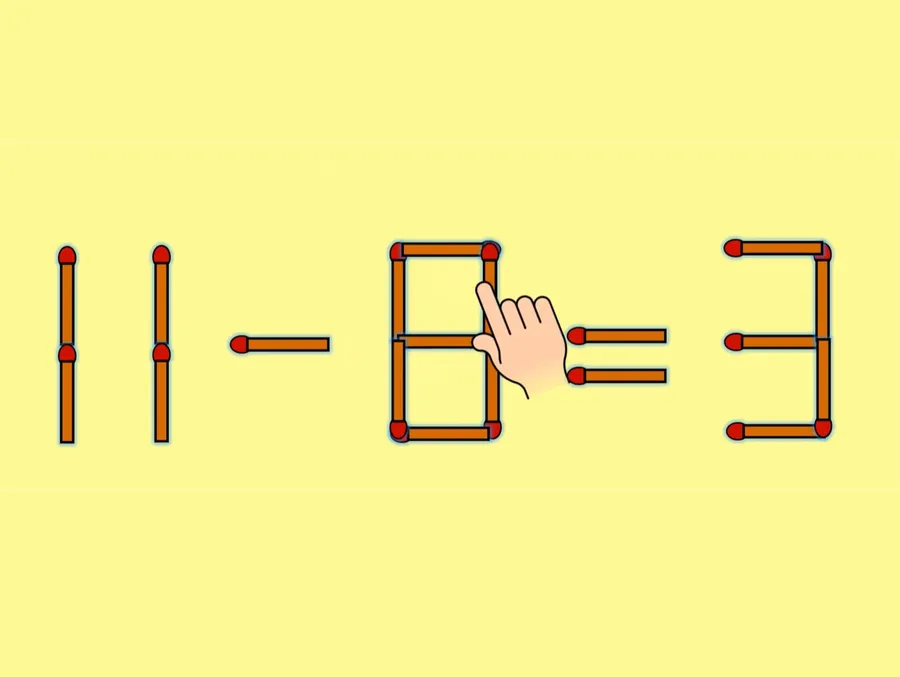 REZOLVARE: Pentru a corecta ecuația 11 + 6 = 3, trebuie să muți un băt de chibrit orizonatal de la semnul + (astfel încât să devină -) și să îl muțoi la cifra 6, astfel încât să devină 8. Prin urmare, ecuația corectă devine: 11 – 8 = 3.
