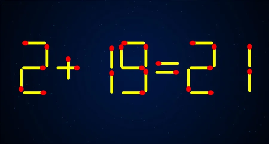 Pentru a corecta egalitatea, tot ce trebuie să faci este să iei bățul de chibrit așezat orizontal din componența cifrei 7 și să îl atașezi în poziție verticală la cifra 3. Astfel, cifra 7 se transformă în cifra 1, iar cifra 3 în cifra 9. După mutarea făcută, egalitatea devine corectă: 2 + 19 = 21.