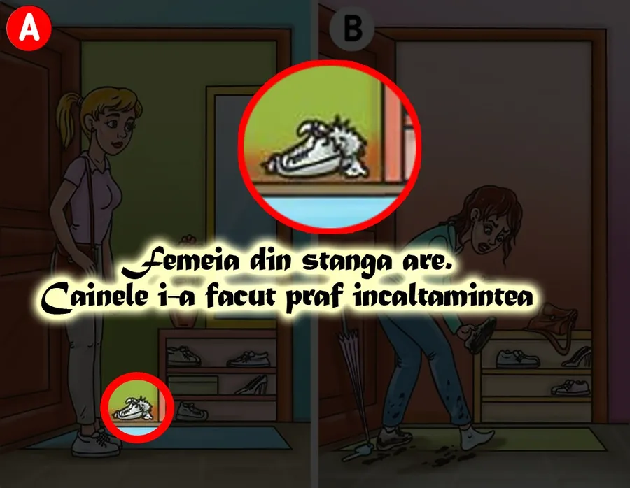 Rezolvare: Cele două imagini sunt complexe pentru că prezintă foarte multe elemente. Din acest motiv, este foarte greu să identificați răspunsul corect. Așadar, dacă ați reușit să deslușiți provocarea repede sunteți adevărate genii. Ei bine, femeia din prima fotografie este cea deține un câine. Se poate observa că animalul de companie i-a făcut praf încălțămintea. Priviți cu atenție pozele de mai jos pentru a înțelege mai bine!