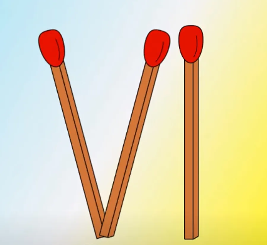 Rezolvare: La prima vedere, cu toții suntem tentați să spunem că nu există nicio variantă de mutare a celor trei bețe de chibrit pentru a forma cifra 6, fără a rupe niciunul dintre bețe. Totuși, dacă ne uităm cu mare atenție, se poate observa că printr-o simplă mutare a unui băț de chibrit găsim răspunsul corect. Mai exact, prin înclinarea spre dreapta a bățului aflat în partea stângă a imaginii se obține cifra 6 în scriere romană.
