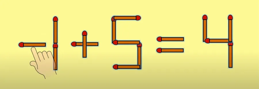 Așadar, 7 + 5 = 4 este greșit, iar pentru a corecta egalitatea trebuie să mutați bățul de chibrit așezat orizontal, cel care formează cifra 7, în față. În acest fel, veți obține -1, iar ecuația corectă va deveni -1 + 5 = 4.
